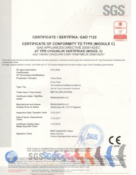 This certificate confirms that the camping stove is in compliance with European standards and requirements, which gives us the right to use and place the CE mark on the product.
