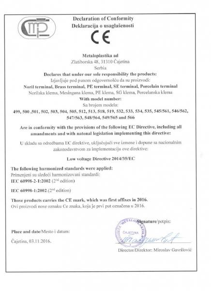 In accordance with the plans and continuous development, we certified the terminal blocks according to the provisions of the EC directive (Low Voltage Directive 2014/35/EC) and the harmonized standards IEC 60998-1 and IEC 60998-2-1. After a successful test, we obtained the right to use the CE mark, approved by the accredited testing laboratory SIQ from Slovenia.